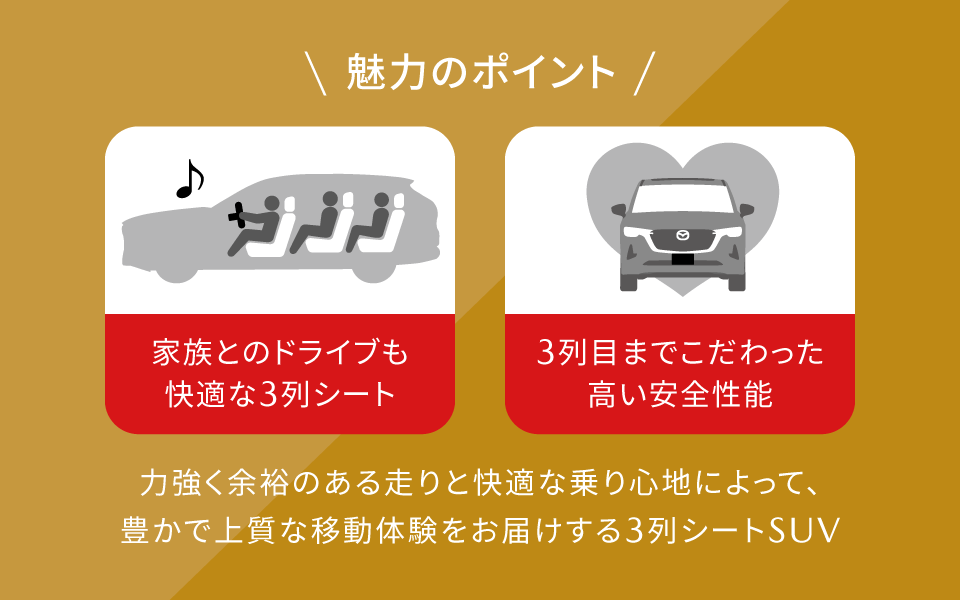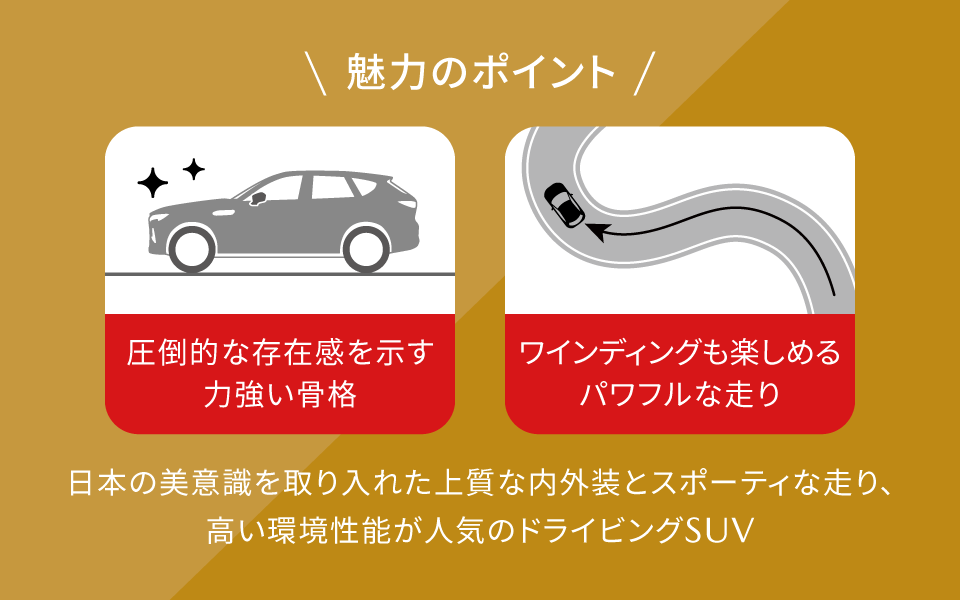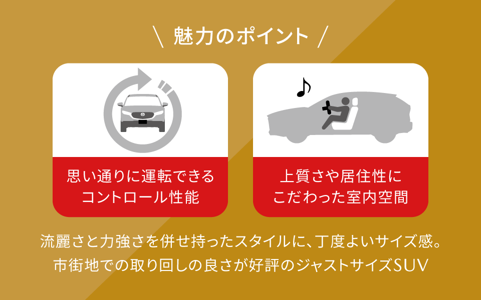 マツダのSUVは、コンパクトなジャストサイズからラージサイズまで幅広いラインナップ。